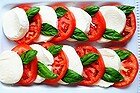 Салата Капрезе - стъпка по стъпка в снимки Начин на приготвяне: Нарязваме доматите и моцарелата на парчета и ги подреждаме в линия, като застъпваме краищата им, а отгоре поставяме по един лист босилек.